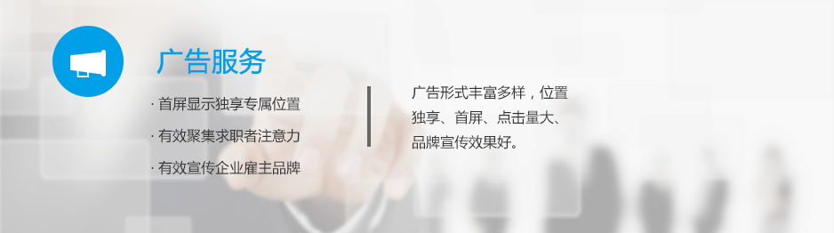 廣告服務(wù)基于龐大的網(wǎng)絡(luò)平臺(tái),位于首屏,企業(yè)客戶可以在首頁(yè)擁有專享位置,被推薦的職位和公司始終占據(jù)求職者的第一視線,極大地聚焦求職者的注意力,從而大幅度提升招聘職位的關(guān)注度、點(diǎn)擊量及招聘效果。廣告有知名企業(yè)招聘、熱點(diǎn)招聘、品牌招聘、搜索置頂、海報(bào)等多種類(lèi)型。企業(yè)客戶可根據(jù)招聘需求選擇合適的廣告類(lèi)型,完成招聘需求。